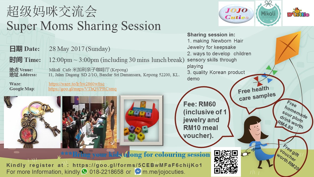 Play based learning is an interesting area of knowledge to explore especially for parents. JOJO Cuties and D'Little are arranging a super mom sharing session on ways to develop sensory skills of Children through playing on next Sunday, 28/5 at Mikali Cafe. Feel free to join us!
